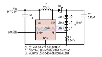 G1506是一種專為以恒定電流來驅(qū)動白光LED而設(shè)計的升壓型DC/DC變換器。該器件能利用一節(jié)鋰離子電池來驅(qū)動兩個、三個或四個串聯(lián)的LED采用LED串聯(lián)連接的方法可以提供相等的LED電流·從而能獲得均勻的亮度且無需鎮(zhèn)流電阻器。